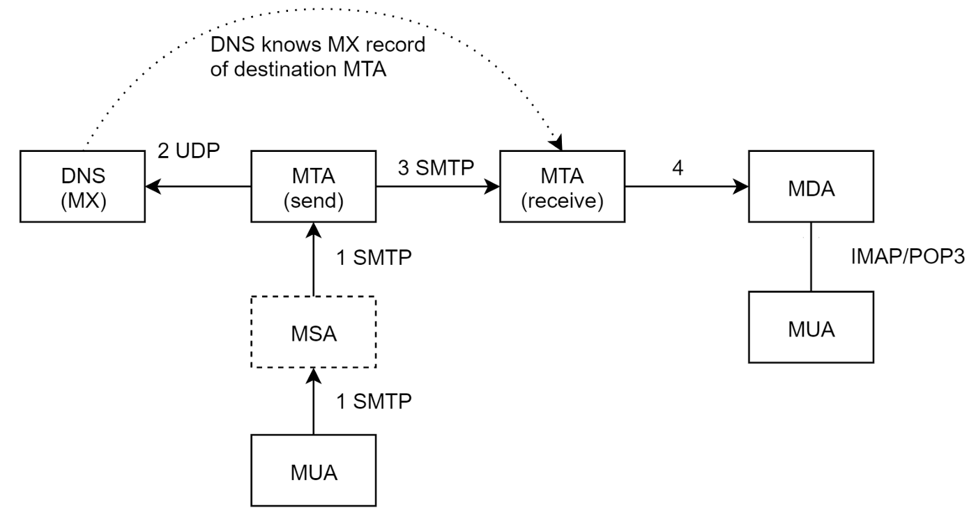 Bản thân các ứng dụng gửi email đóng vai trò các MUA (Mail User Agent). Khi người thực hiện gửi, email sẽ được chuyển tới MSA (Mail Submit Agent) cũng chính là MTA (Mail Transfer Agent) biên đầu, thường thì MSA và MTA biên đầu cùng chạy trên một máy.