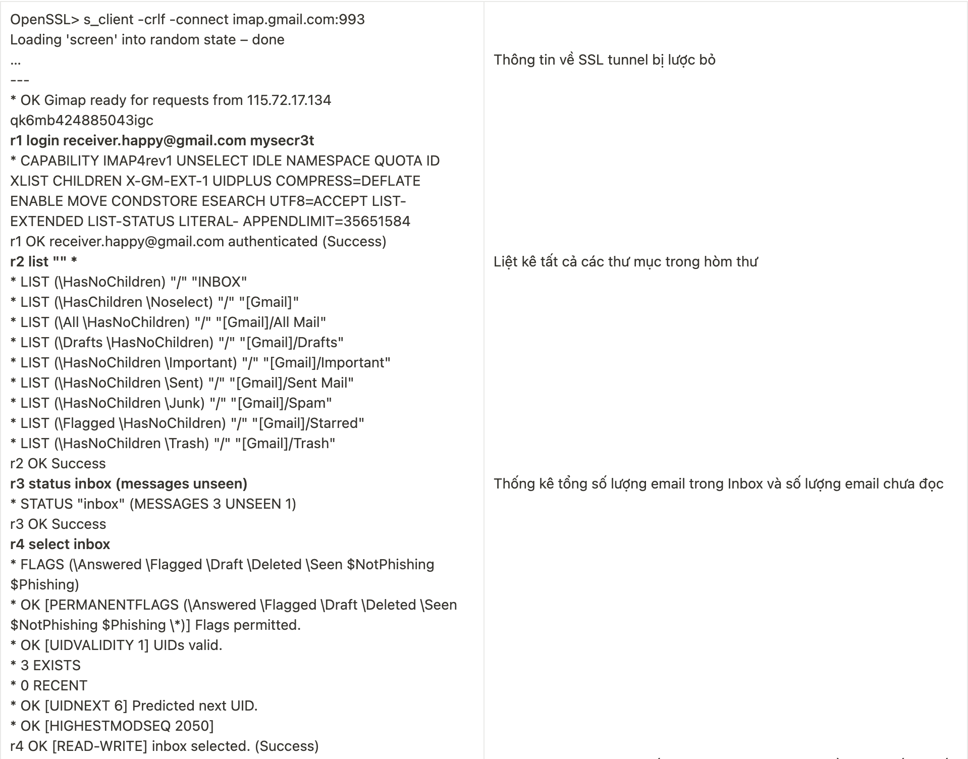 Hòm thư trên server được chia thành nhiều thư mục (hộp thư đến, thư đã gửi,…) và hỗ trợ người dùng tạo thư mục riêng. Với mỗi Email, IMAP cho phép gắn cờ để theo dõi trạng thái của thư đó và tải vể một phần hoặc toàn bộ. IMAP sử dụng port mặc định là 143, port cho kênh truyền mã hóa SSL là 993. Một phiên làm việc với IMAP cũng tương tự POP3, khác nhau ở các bước (*)