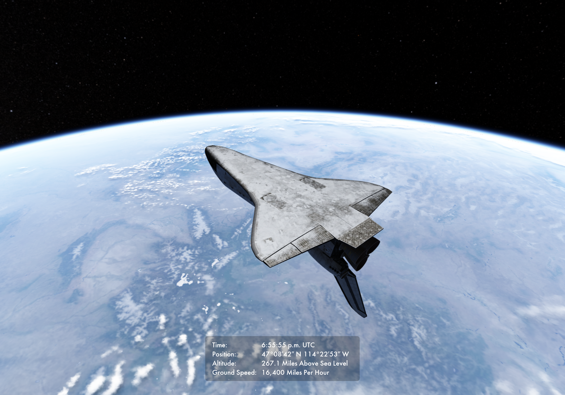 Last year, I was trying to create my own space program to deploy a satellite into Earth’s orbit and later bring it back to Earth safely. Below is an attempt of the space shuttle starting its reentry—the most dangerous phase of any space mission. The other dangerous phase is liftoff, which occurs just a few seconds after ignition.