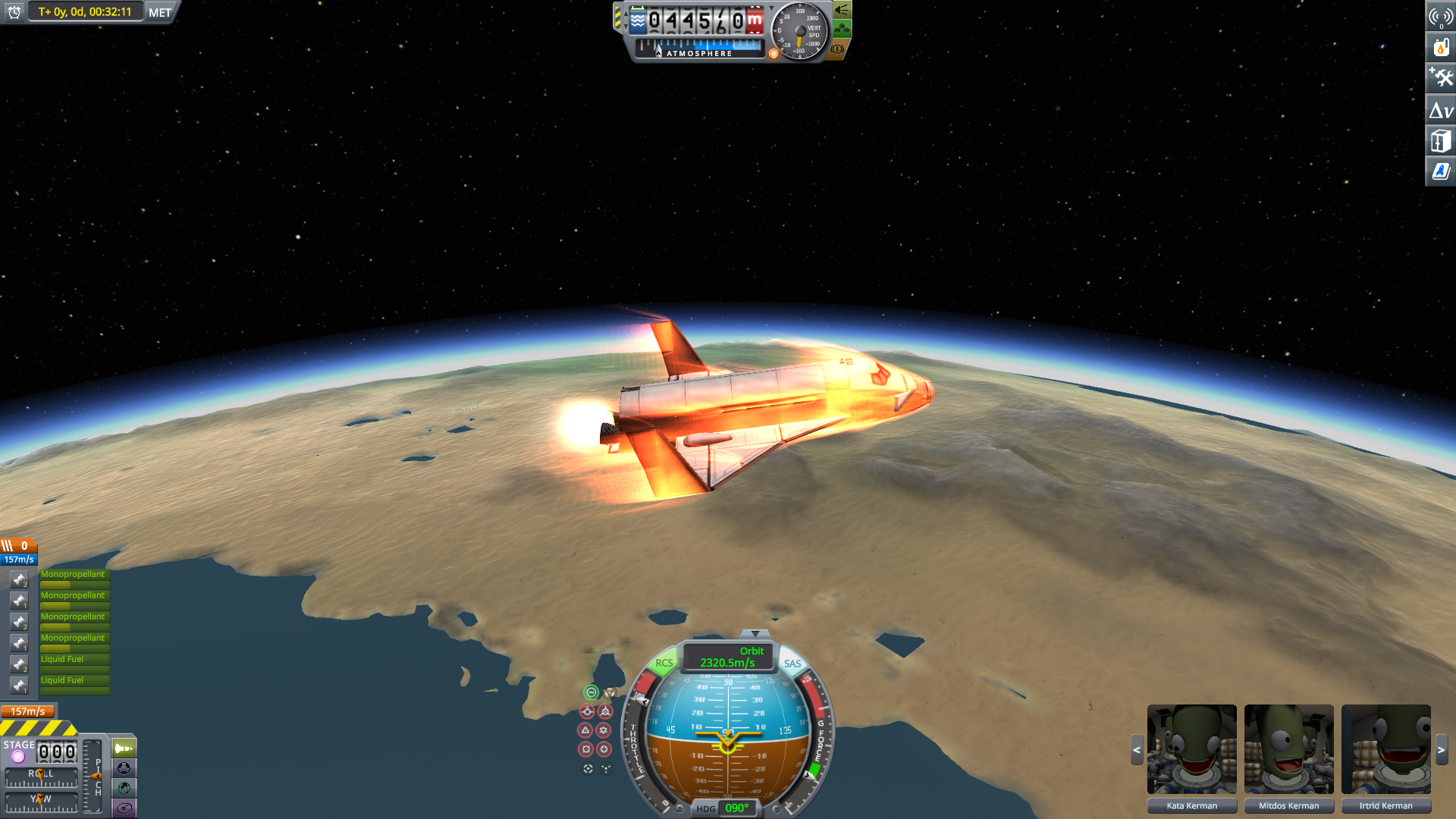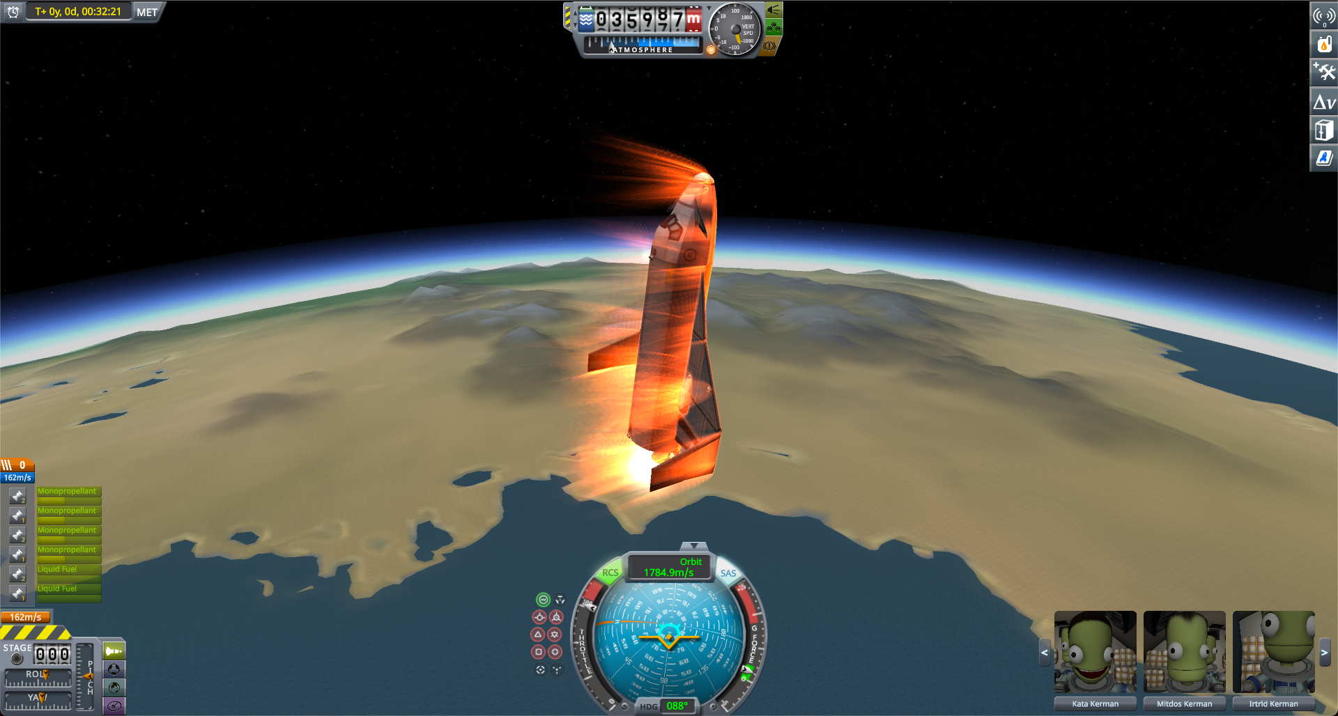 On my first attempt, my space shuttle just spun or stood upright like this as it was hard to keep the vehicle balanced. After several attempts and gaining more experience, I finally mastered the skill to pilot it effectively. For advanced and precise maneuvers, the community provides scripting integration module, which allows me to write autopilot code.