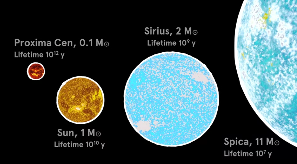 The lifetime of a main sequence star depends on its mass. The more massive the star, the shorter its lifetime. Massive blue stars like Spica live for only 10 million years. The sun will live for 10 billion years and most red dwarfs live for over a trillion years. What happens after the main sequence also depends on mass.