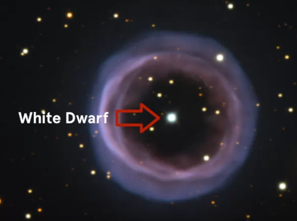 At the core of a planetary nebula lies a white dwarf, a small dense object about the size of the Earth. White dwarfs are the exposed cores of red giants after their atmospheres have been ejected. They are very hot, but not very bright, typically 100 to 1,000 times fainter than stars like the sun. White dwarfs gradually cool and fade, radiating their thermal energy into space.
