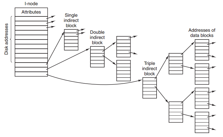 Giải pháp thứ hai ở đây là sẽ có một hoặc nhiều disk address cuối, thay vì là địa chỉ của data block sẽ là địa chỉ của block các pointer. Lúc này disk address cho data block được gọi là direct address, địa chỉ của block các pointer sẽ là single indirect address, double indirect address hay triple indirect address tùy thuộc vào số lần nó phải tham chiếu để đến data block.