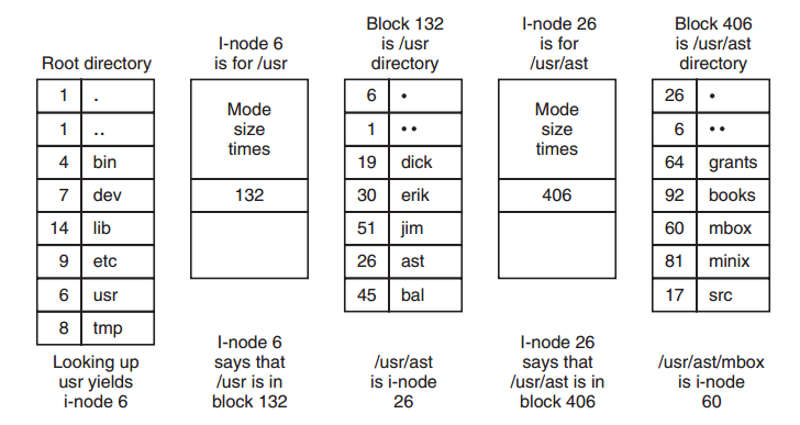 Như đã nêu trên, Unix file system là cơ bản là một đồ thị hình cây có gốc là root directory. Root chứa tập hợp các entry và hệ thống sẽ tìm ra entry có filename là usr với i-node tương ứng là 6. Đi tới i-node 6 thấy “/usr” nằm tại block 132. Tiếp tục tìm kiếm trong “/usr” directory thấy “/usr/ast” có i-node 26. I-node 26 cho biết “/usr/ast” ở block 406. Block 406 giúp hệ thống biết được mbox có i-node 60. Cuối cùng hệ điều hành sẽ nạp i-node vào bộ nhớ và kết thúc tìm kiếm.